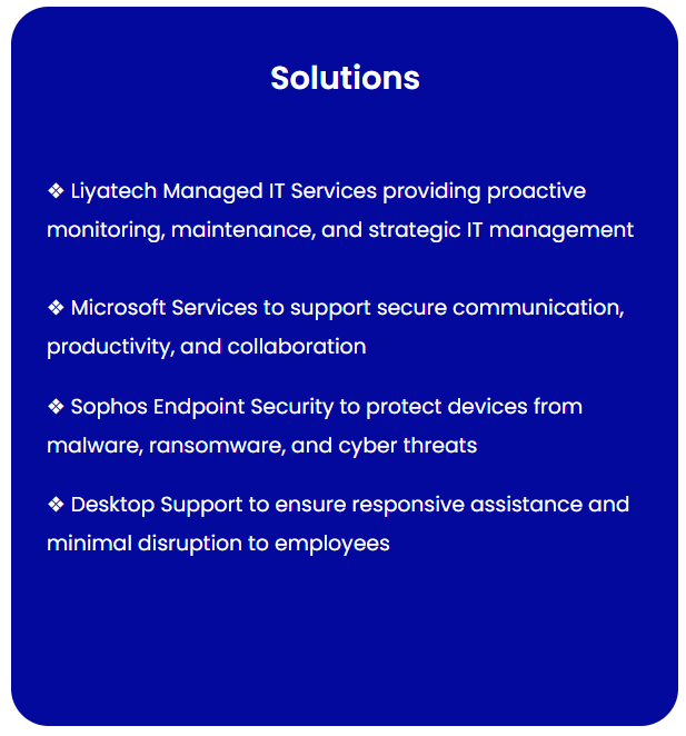 “Working with Liyatech has strengthened our technology environment and improved how our systems support our operations. Their team is responsive, knowledgeable, and committed to helping us maintain secure and reliable systems as our business continues to grow.”
