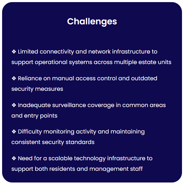 “Liyatech provided the expertise and infrastructure we needed to enhance security and operational efficiency across our estates. Their team installed systems professionally and designed them to support both resident safety and estate management needs.”