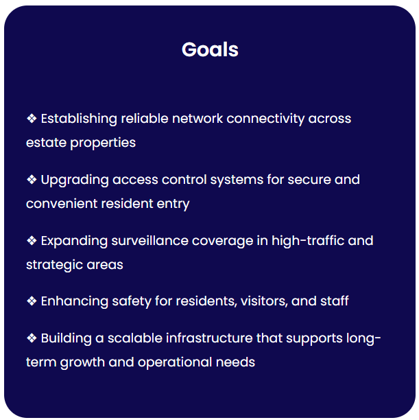 - LAN Cabling and Networking – Ensures stable connectivity for all estate operations
