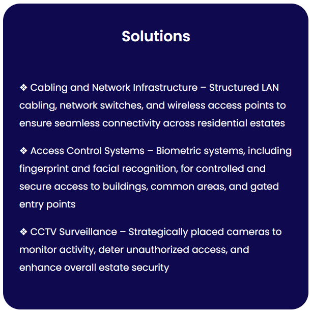These systems work together to create a safe, connected, and efficiently managed residential estate.
